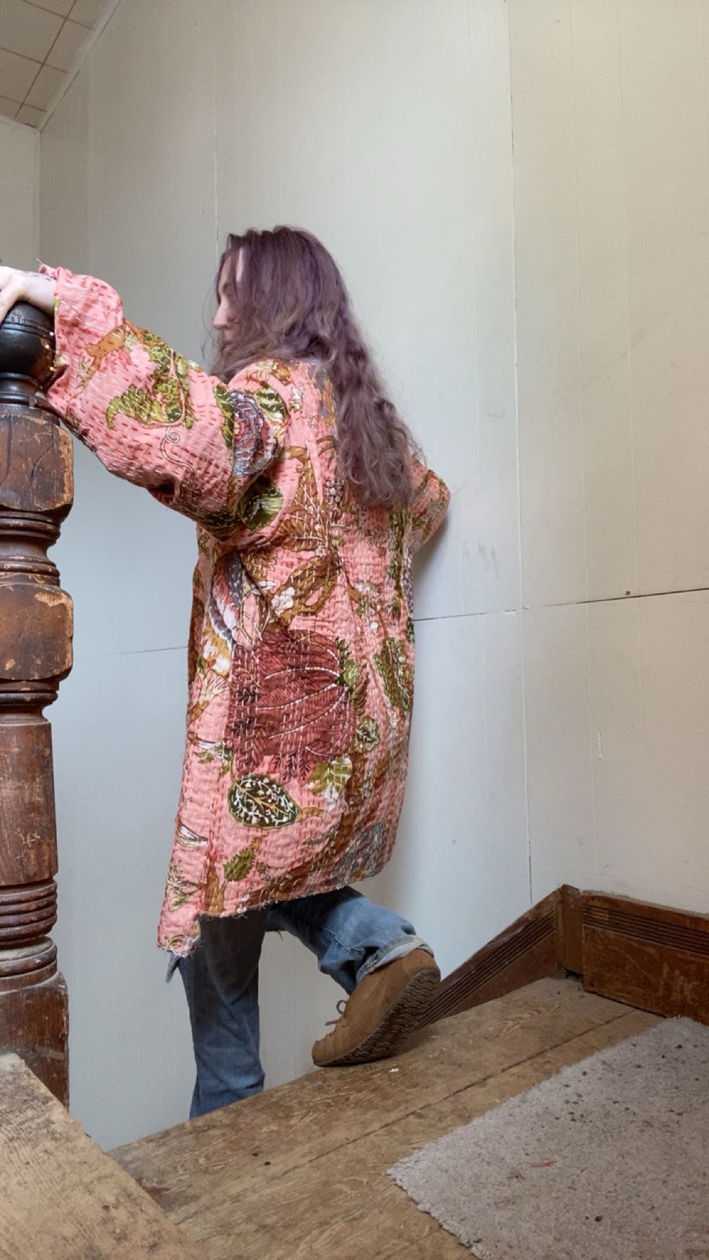 The kimono is a soft cotton material. In its previous life, it was a handmade, hand-stitched kantha quilt.