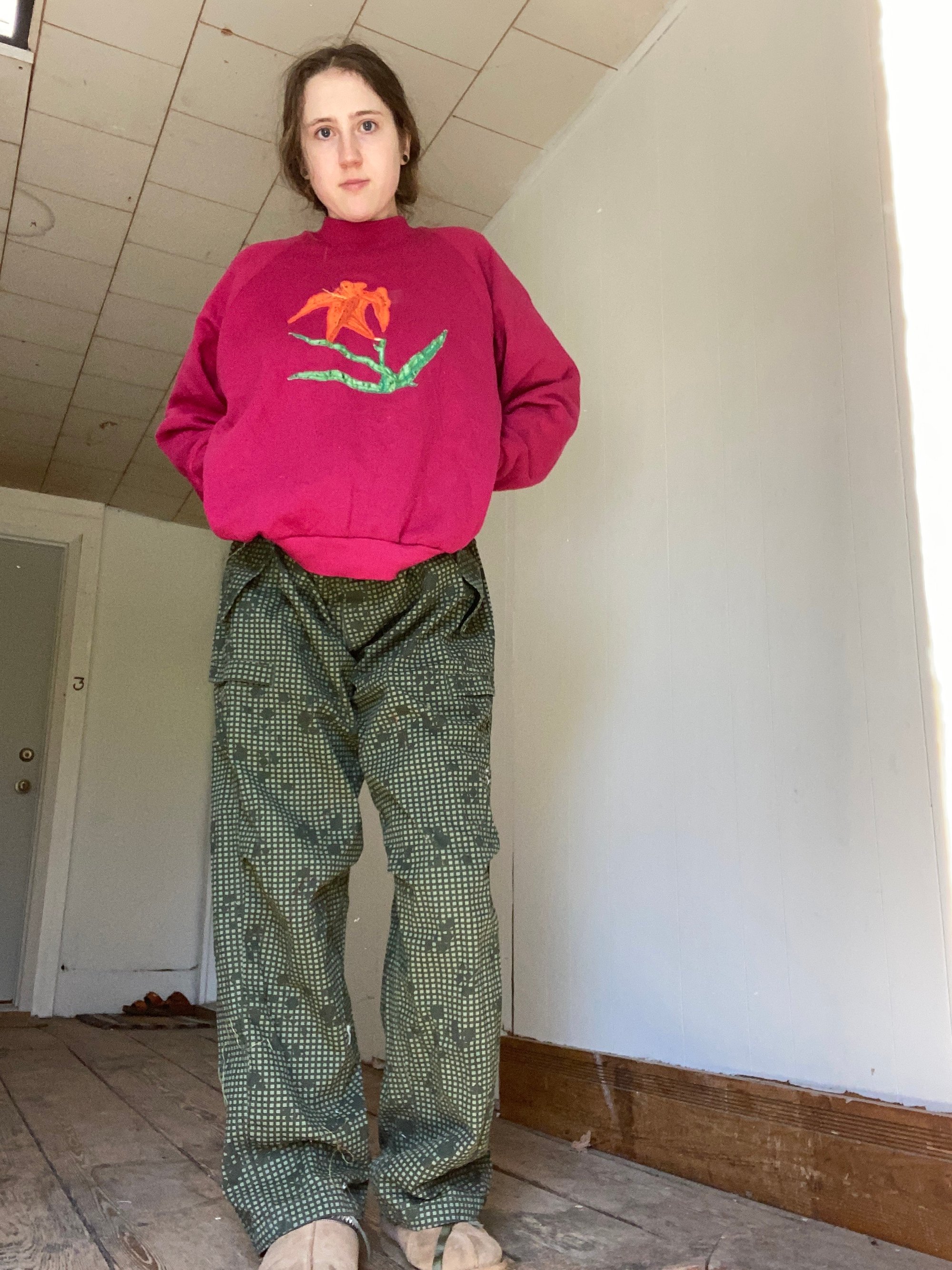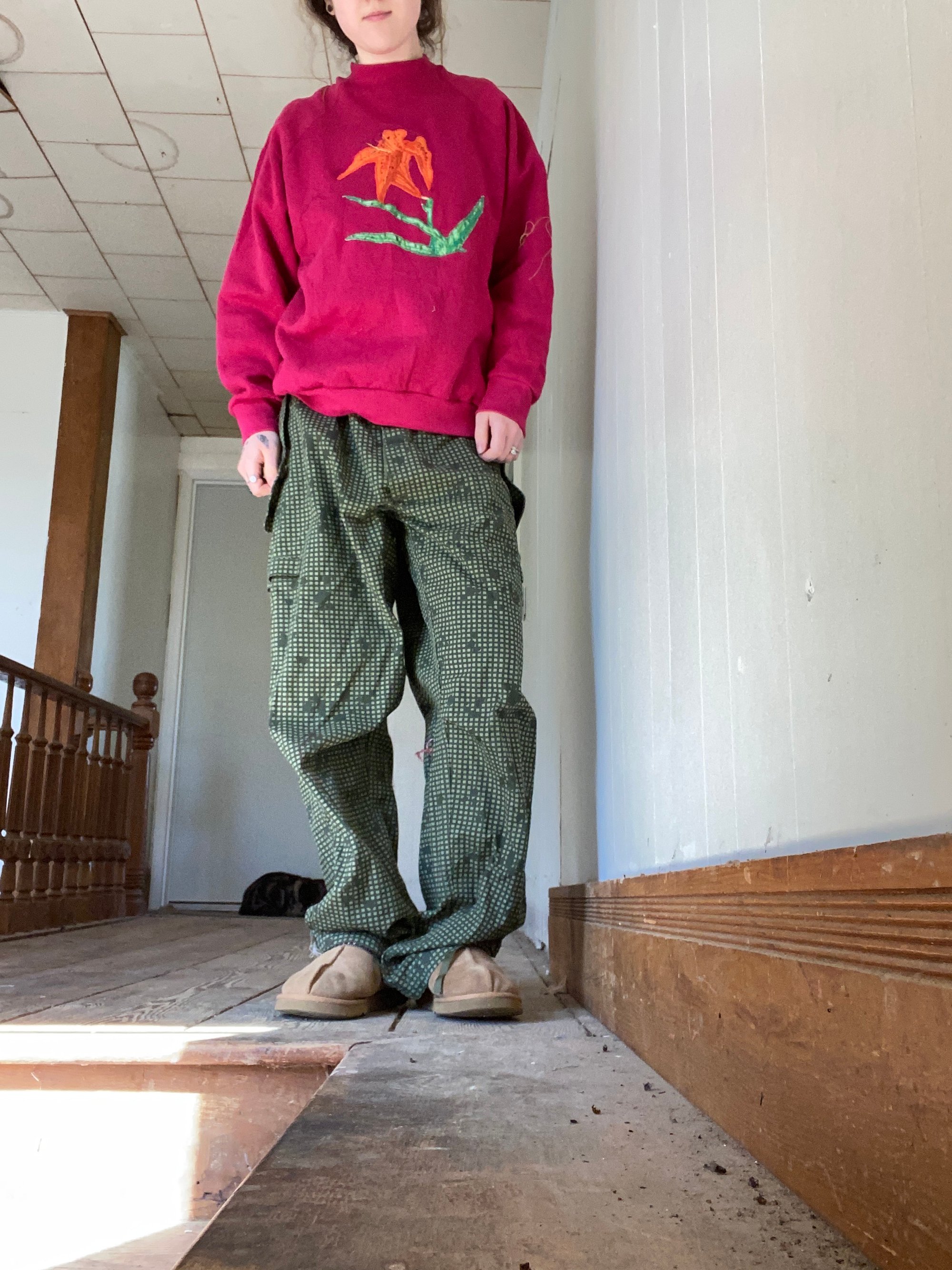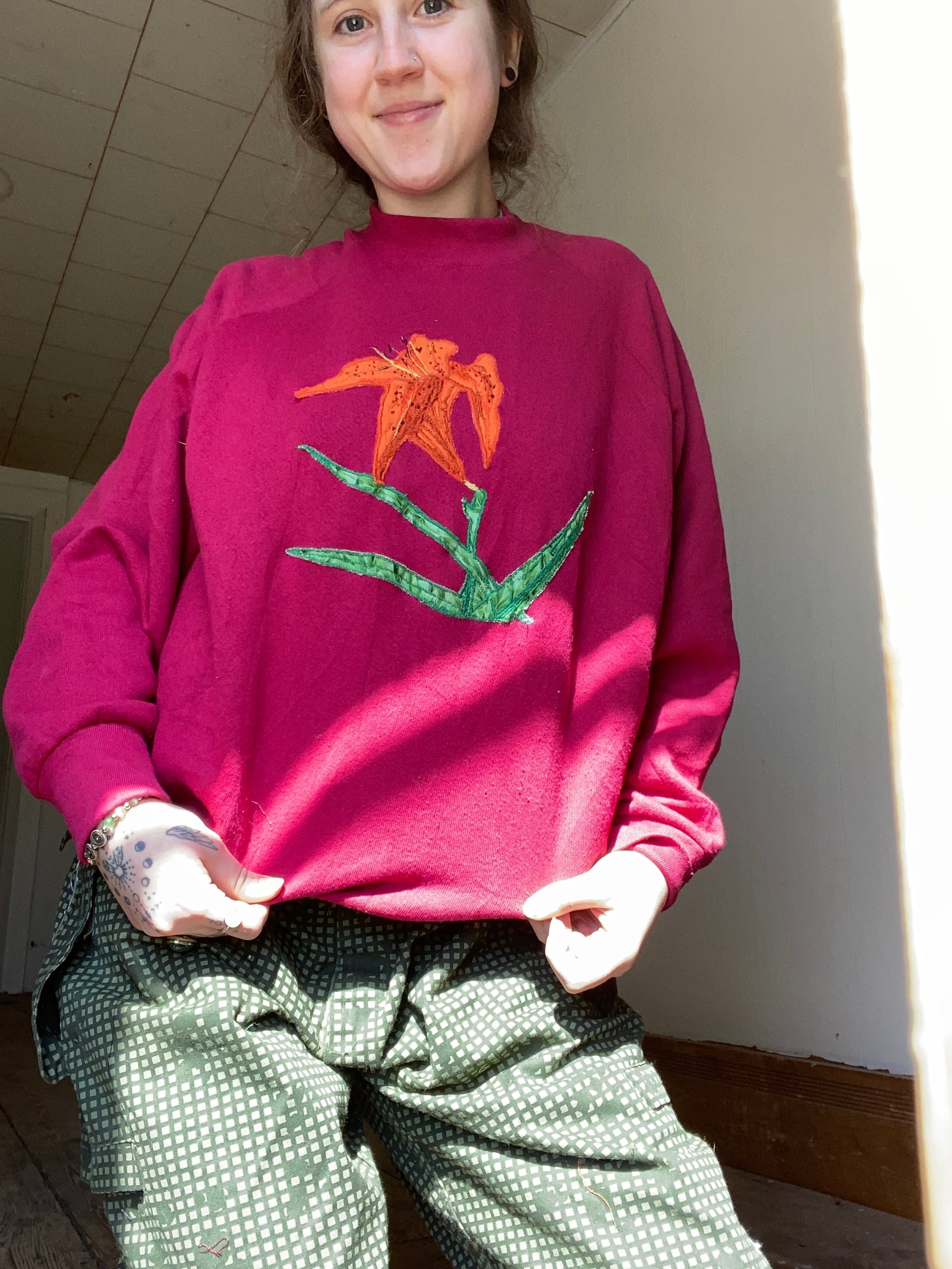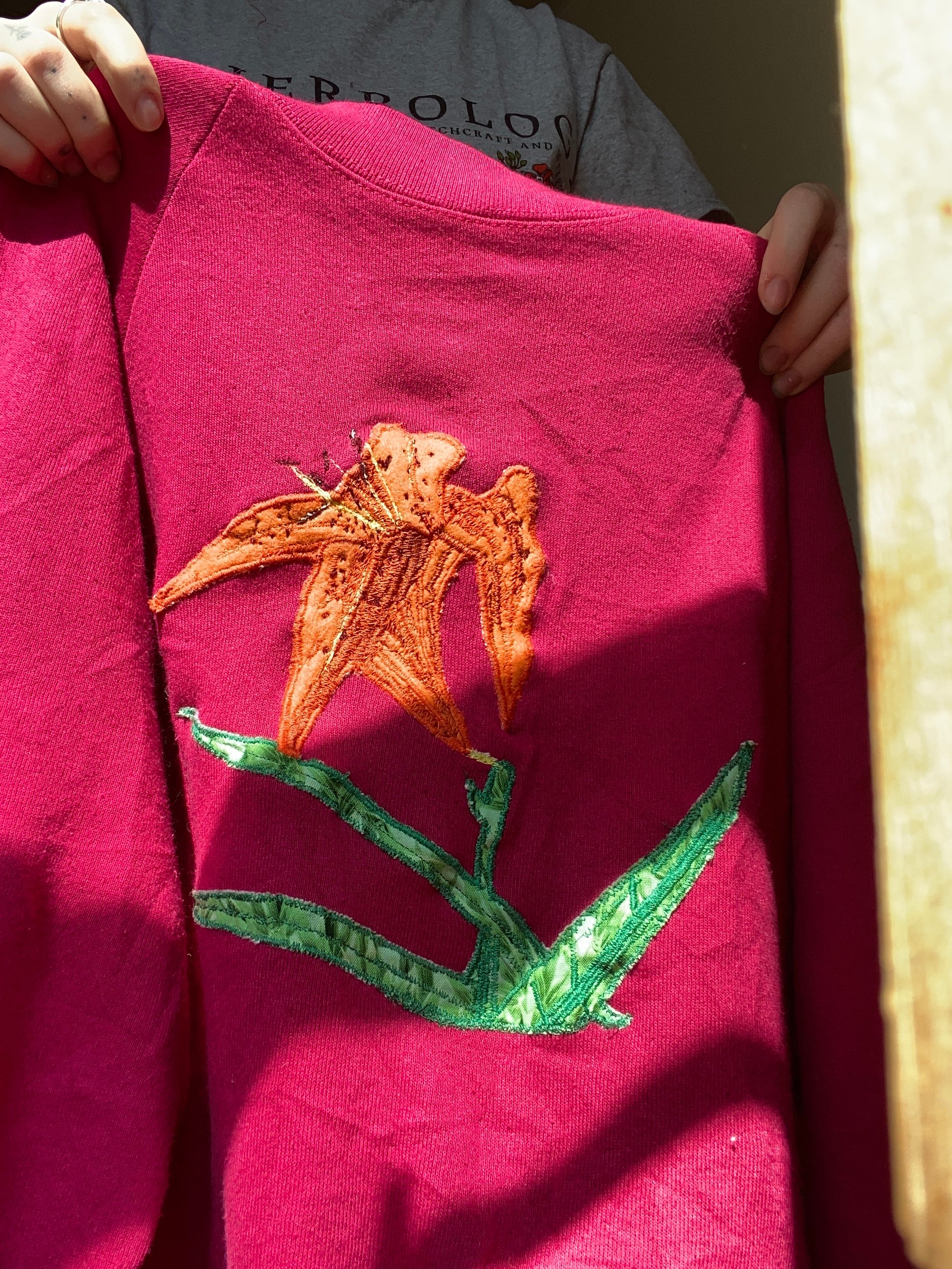 Hand-Embroidered on soft, thick, vintage crewnecks of various colors and sizes. The Tiger Lily Crewneck is a small batch- I'm only doing up to 8 of them. Firstcomers get the first pick of the sweatshirt colors and sizes. This pink one is not available. Though each lily will be made using the same stencil and base colors, the hand embroidery will differ in each one. The thread patterns and colors in the hand-embroidery may not be the same in each lily due to the artistry of making the item by hand. They will look relatively the same.